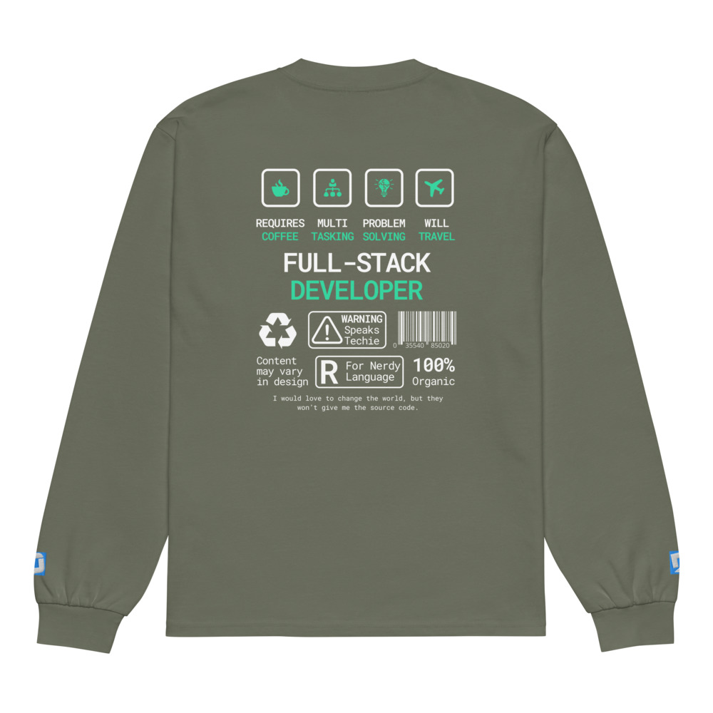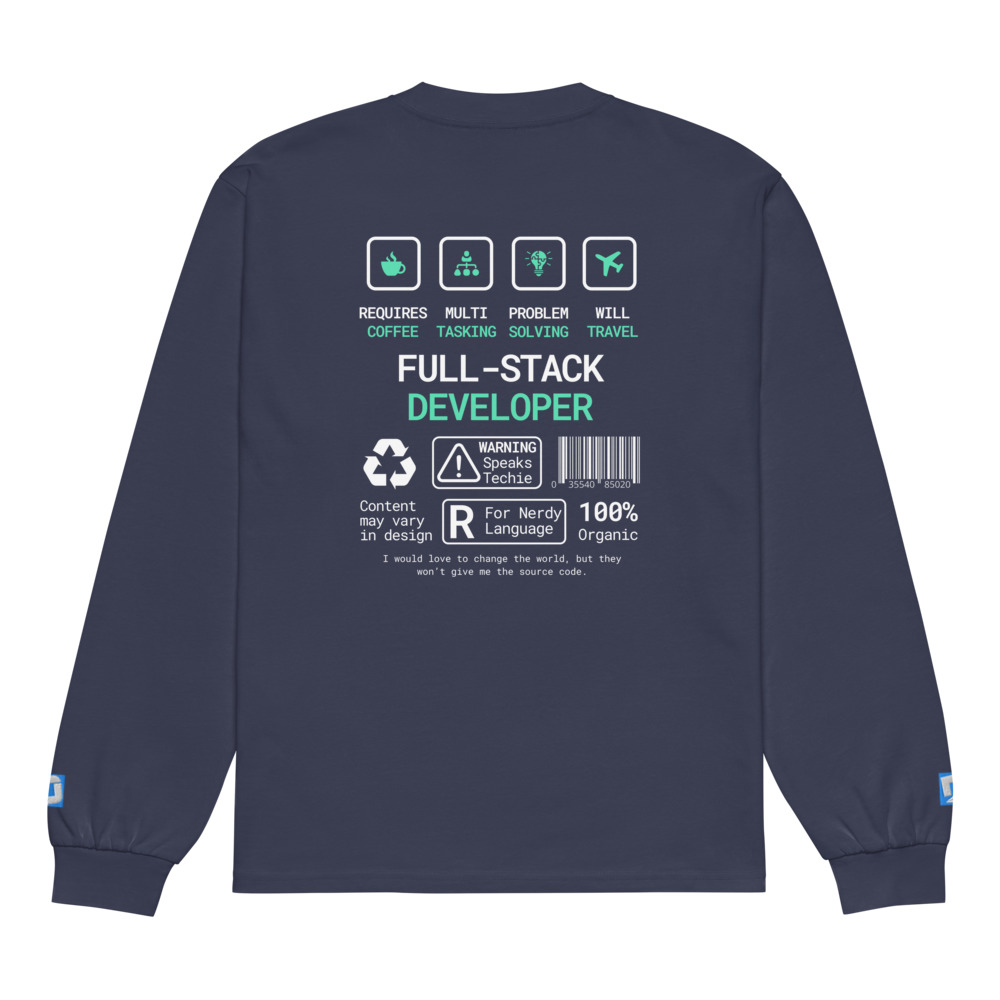 Freshen up your wardrobe with this modern, premium Talk Nerdy Full-stack Dev Long Sleeve shirt. Its heavyweight fabric and relaxed fit ensure its not just any sweatshirt but your go-to for every occasion. Wrap yourself in the comfort of 100% carded cotton and make your everyday style look effortless.